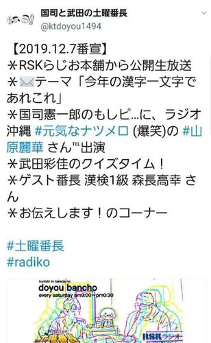★ 今夜8時〜は、ラジオ沖縄「山原麗華の元気なナツメロ(爆笑)」生放送でお送り致します🌟★ 明日6日(土)は、RSKラジオ(岡山、香川エリア)「国司と武田の土曜番長」に電話出演します🤩 (土曜番長ツイッターより)ぜひ、お聞きください🙇💕 🌟山原麗華🌟