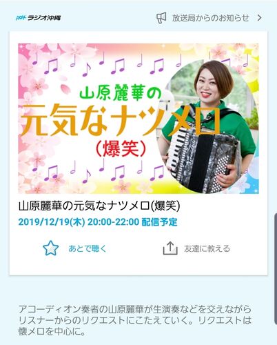 こんばんは | ‹:)~❁今夜も、ラジオ沖縄「山原麗華の元気なナツメロ(爆笑)」を お聞き頂き、ありがとうございました皆様からのメッセージやFAX、お手紙やおハガキ、ツイートのおかげで、とても楽しく放送させて頂きました☺❤radikoというアプリでは本日の番組が1…