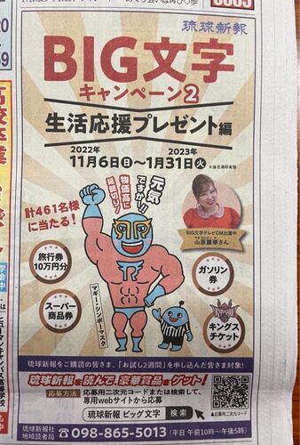 おはようございます 皆々様に、嬉しいお知らせです⭐️ 琉球新報『BIG文字キャンペーン第2弾』が始まっています 生活応援プレゼント編という事で、 応募期間は、 11月6日〜2023年1月31日まで。 なんと!合計461名さまに商品券などが当たります 詳しくはコチラ…