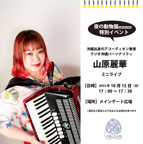 【出演情報】 沖縄こどもの国、夜の動物園特別イベントに出演します 日時:10月15日(日) 17時〜場所:沖縄こどもの国メインゲート広場入園料:(大人)1000円、(中人)300円、(小人)100円、(3歳以下)無料 童謡やお子さん向けの曲、昭和歌謡も歌います 皆さん、…