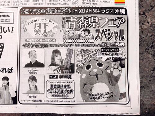 1/12(日) お昼1時〜公開生放送の、 ラジオ沖縄 『おひがらサンデー 月下笑人』青森県フェアスペシャルに、ゲスト出演します 吉幾三さんの故郷、青森県吉さんに作って頂いた曲も歌わせて頂きます ぜひ!イオン南風原ショッピングセンター1階 イベント広場へ、…