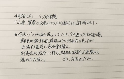 明日のラジオ沖縄『山原麗華の元気なナツメロ(爆笑)』「いつか来た道」の取材音源を編集しています。 一度は対馬丸に乗ったが、直前で船を乗り換えた女性に出会いました。 しかし対馬丸が沈没した後も、執拗に追跡してきた魚雷からどうにか逃れて生き延びた…